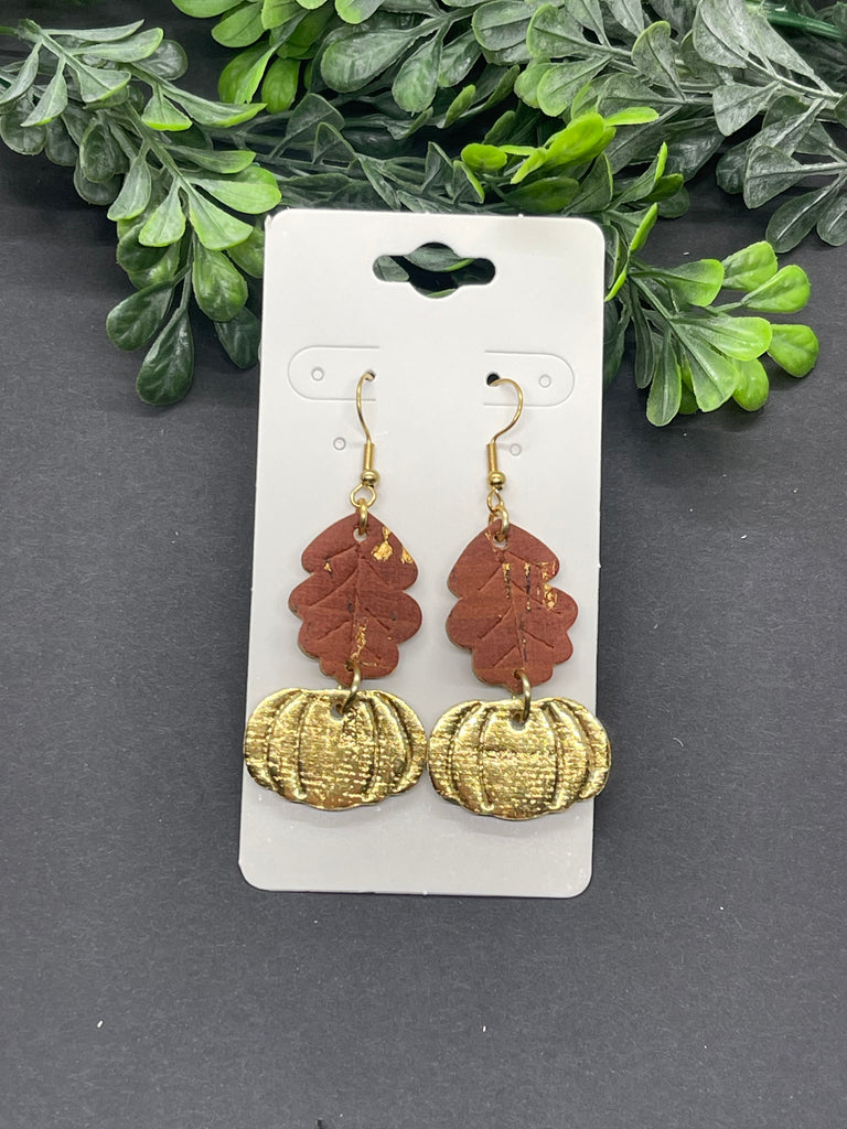 Leaf and Pumpkin Embossed Dangle Cork on Leather Earrings
